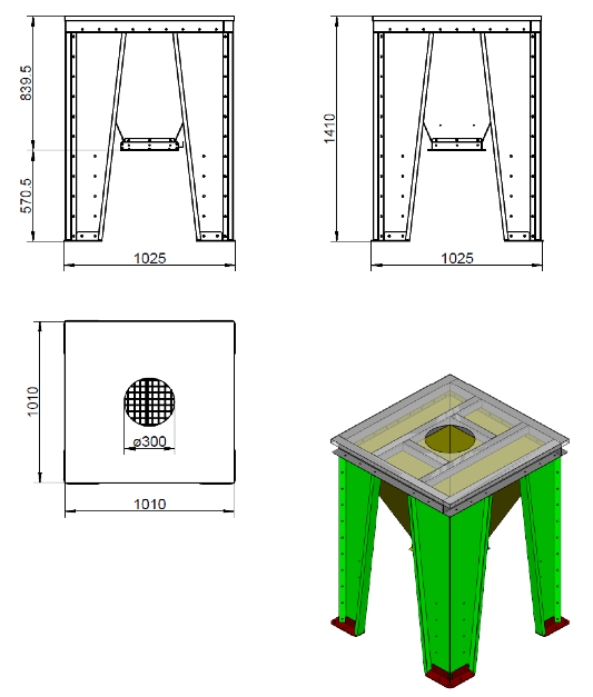 Der Mineralstoffbehälter 280 l in Edelstahl mit lackiertem Standgestell hat eine Aufstellfläche für Bigbags und füllt sich durch die mittige Öffnung 300 mm Ø, die mit einem Gummideckel verschlossen werden kann, wenn der Bigbag entleert ist.