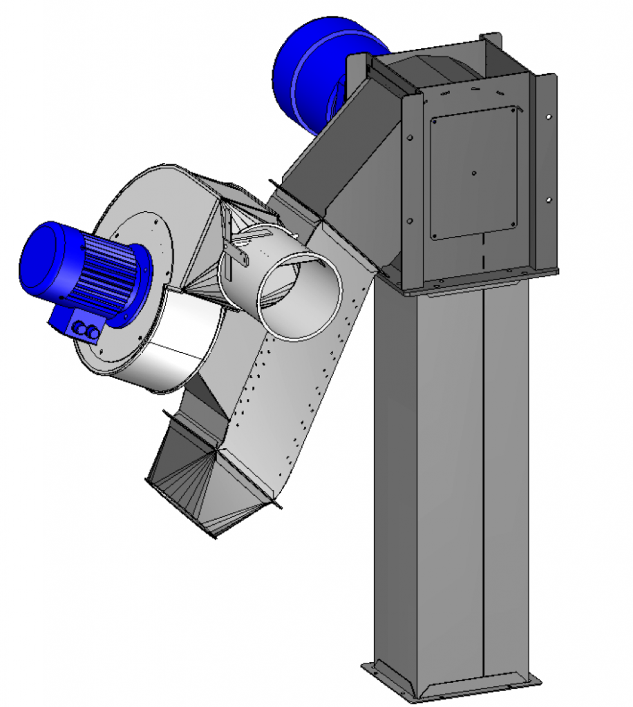 Durch den so aufbereiteten Materialstrom saugt das oben auf dem Reinigungskegel montierte Gebläse Luft und hebt dabei die Partikel heraus, die leichter sind als das Gutmaterial.