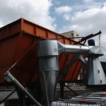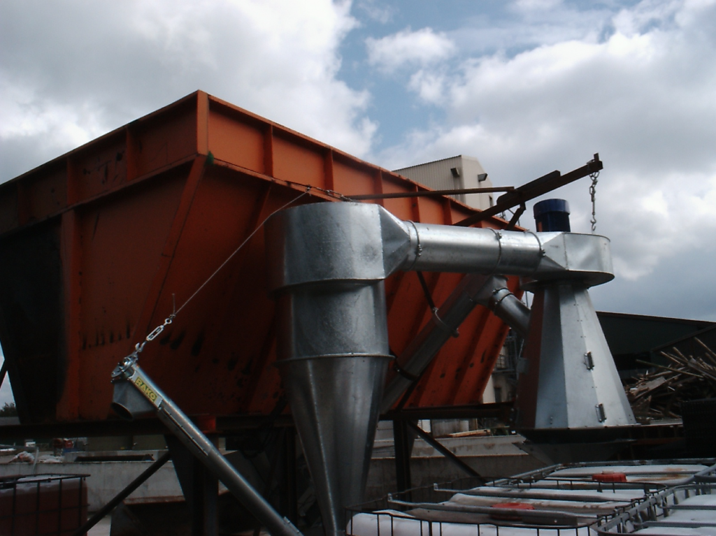 Die Abluft wird in der Regel in einen Zyklonabscheider, verbunden mit einer Staubkammer oder einer Filteranlage (oder eine Kombination aus diesen Komponenten) geleitet, um Luft und ausgereinigtes Material zu trennen.