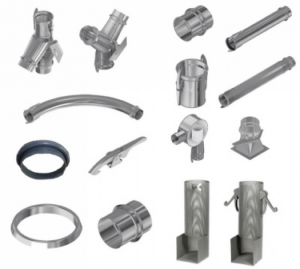 Am gebräuchlichsten und auch kurzfristig lieferbar sind verzinkte Rohrbauteile mit Spannringbördelung in 80 – 100 – 120 mm Ø sowie 3‘‘-Siederohre, die verschweißt oder mit Rohrmuffen verbunden werden.