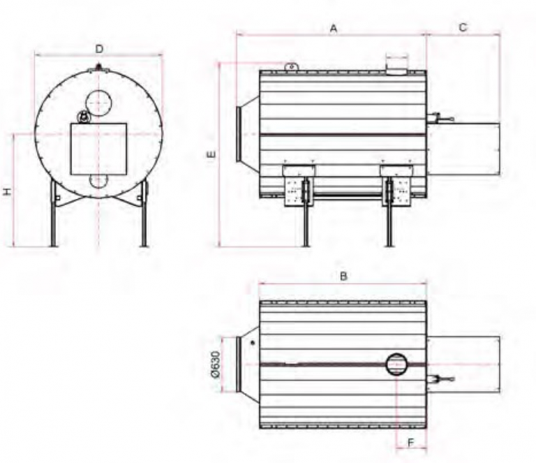 Warmlufterzeuger mit Brennkammer aus hitzebeständigem Stahl, Ölfilter, Sicherheits- und Regelthermostaten, höhenverstellbaren Beinen und Regenhaube.
